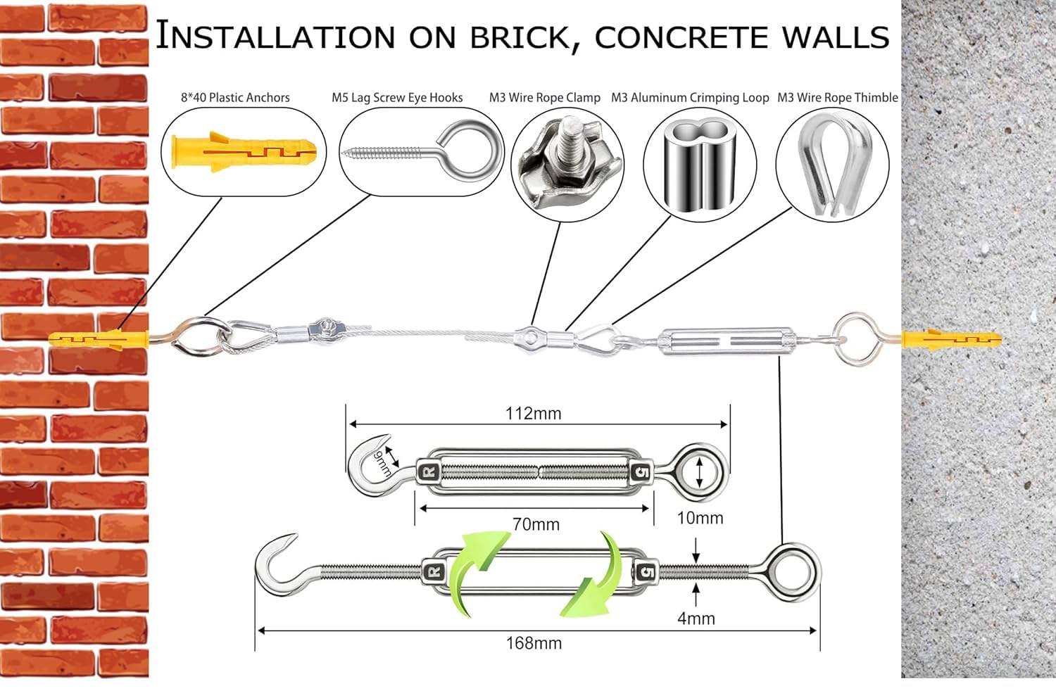 - 【1/8" Turnbuckles for Cables Wire 】:Include 50M 1/8 Wire Rope + 5Pcs M5 Turnbuckle Eye Hooks + 10PcsM5 Lag Screw Eye Hooks+10Pcs M3 Wire Rope Clamp +10Pcs M2 Wire Rope Thimbles+20Pcs M2 Aluminum Crimping Loop +3Pcs M5 Carabiner Hook+10Pcs Plastic Anchors+50Pcs Plastic Tie
