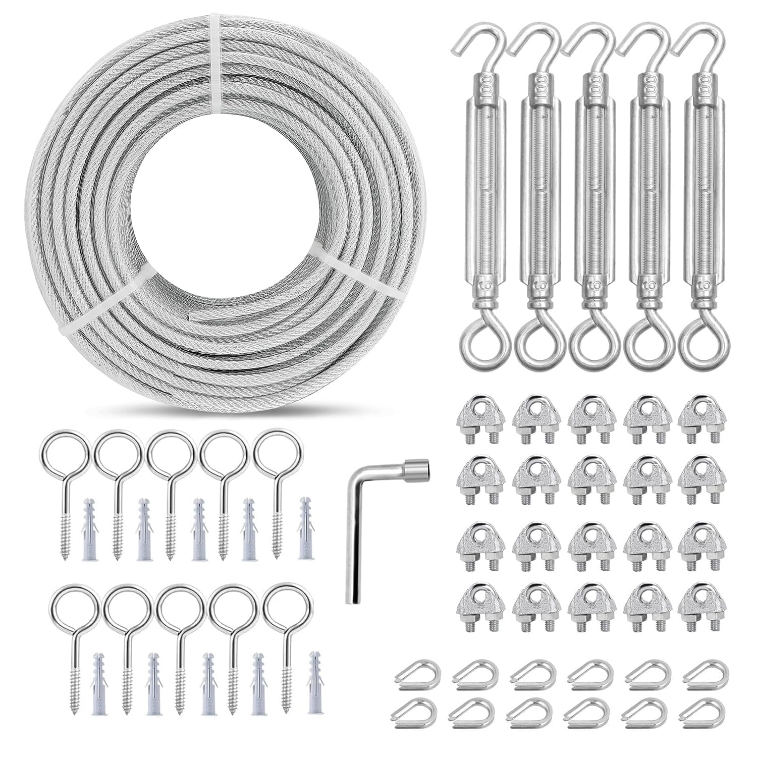 - 1/8" Cable Railing Kit: Package includes wire rope + complete accessories, which are a 100 ft steel cable, 5× M6 turnbuckle hooks and 10× eye screws, 20× U bolt saddle fasteners, 12× steel cable thimbles, 10× expansion pipes, and 1 cable clamp screwdriver