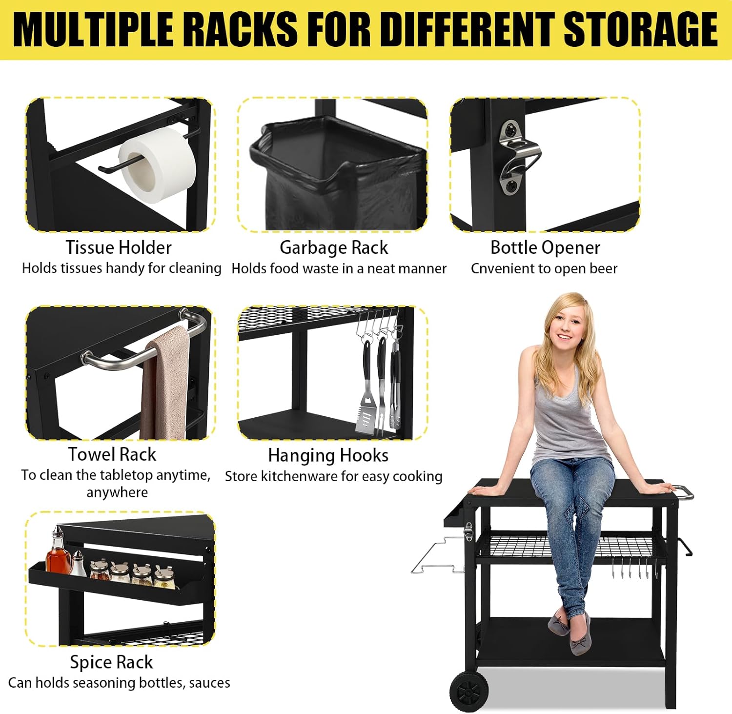 - 【Large Storage】This grill table has two big storage parts, giving you plenty of space for added convenience when organizing and transporting your items. In addition, there has three tool hooks, side spice holder , paper tissue holder, towel rack, garbage rack, bottle opener, etc.