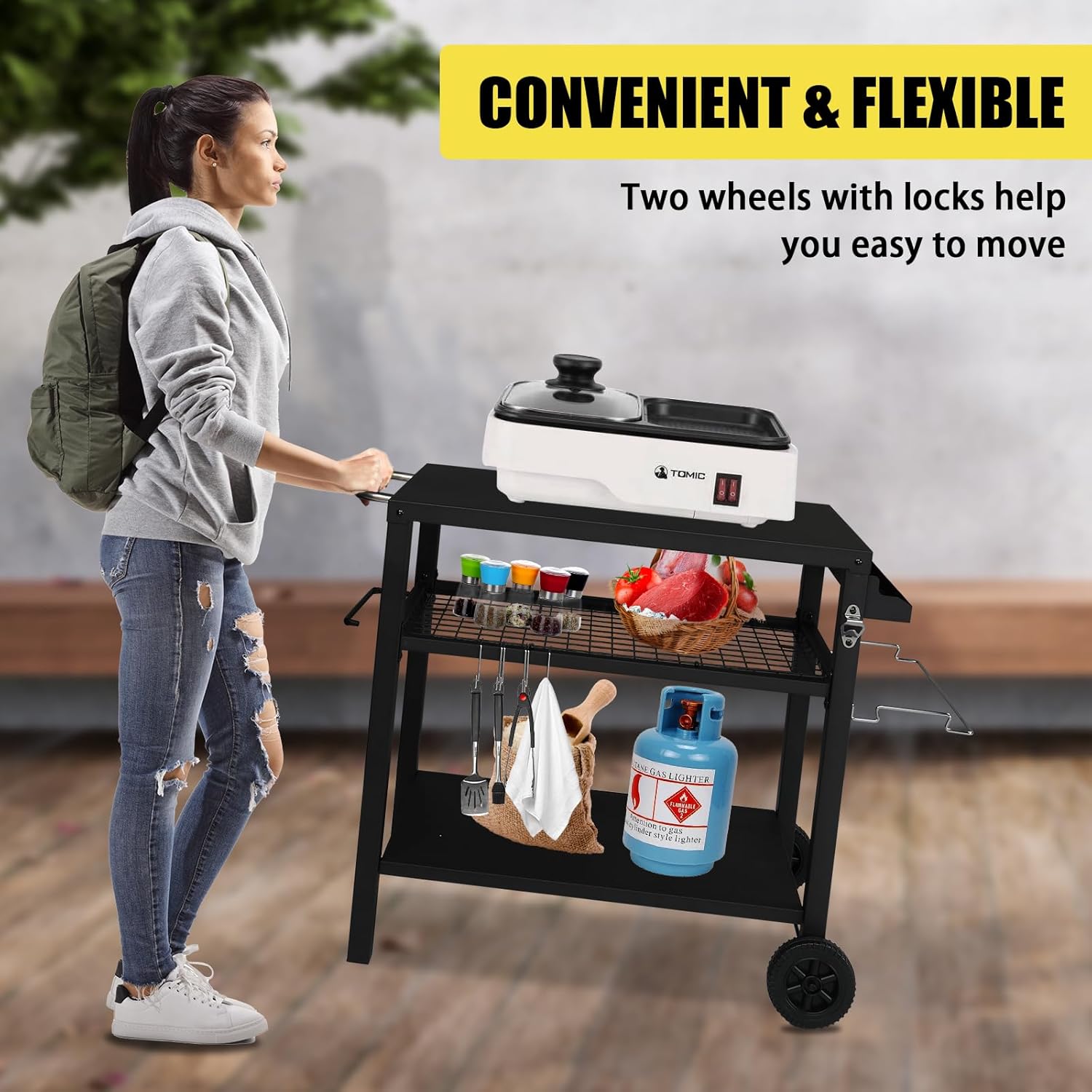 - 【Convenient Design】 This outdoor grill cart has two big wheels and two feet, keeping the whole table structure stable and also convenient for your operation. You can lift up the feet for moving and put down for usage. The ergonomic pusher design saves your strength
