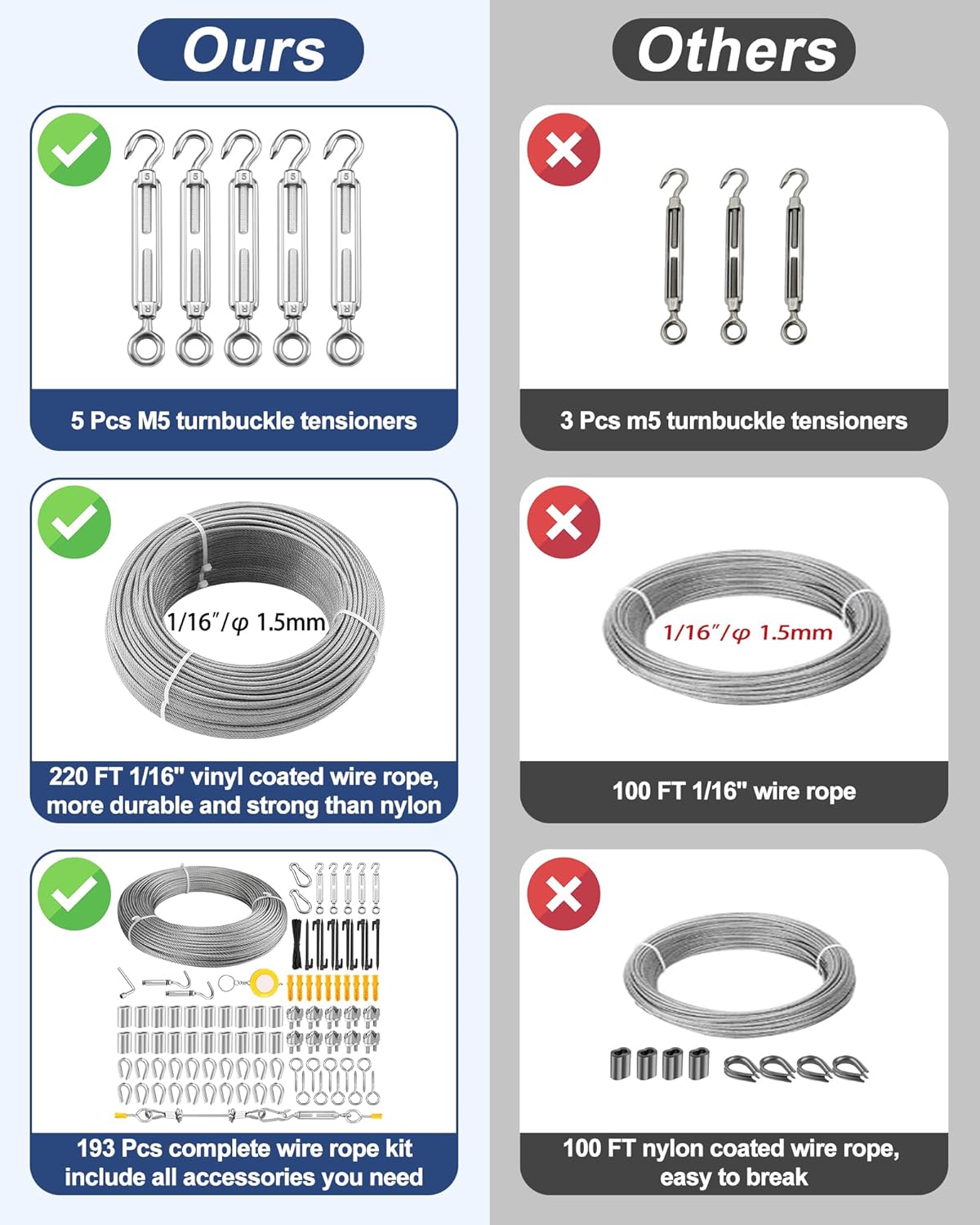 - [192 Pcs Steel Wire Cable Kit] Comkrivy steel cable kit offers more accessories than any other product. It comes with 220 FT 1/16 inch vinyl coated stainless steel cable wire, 20 M3 thimble, 20 M3 aluminum sleeve, 10 M3 wire rope cable clip clamp, 5 M5 turnbuckle tensioners, 2 M5 clips, 10 M5 sheep eye screw hook, 10 M5 plastic anchors, 2 M6 expansion hooks, 10 black tent pegs, 1 socket wrenches, 1 tape measure and 100 black twist ties to meet your different hanging and decoration needs