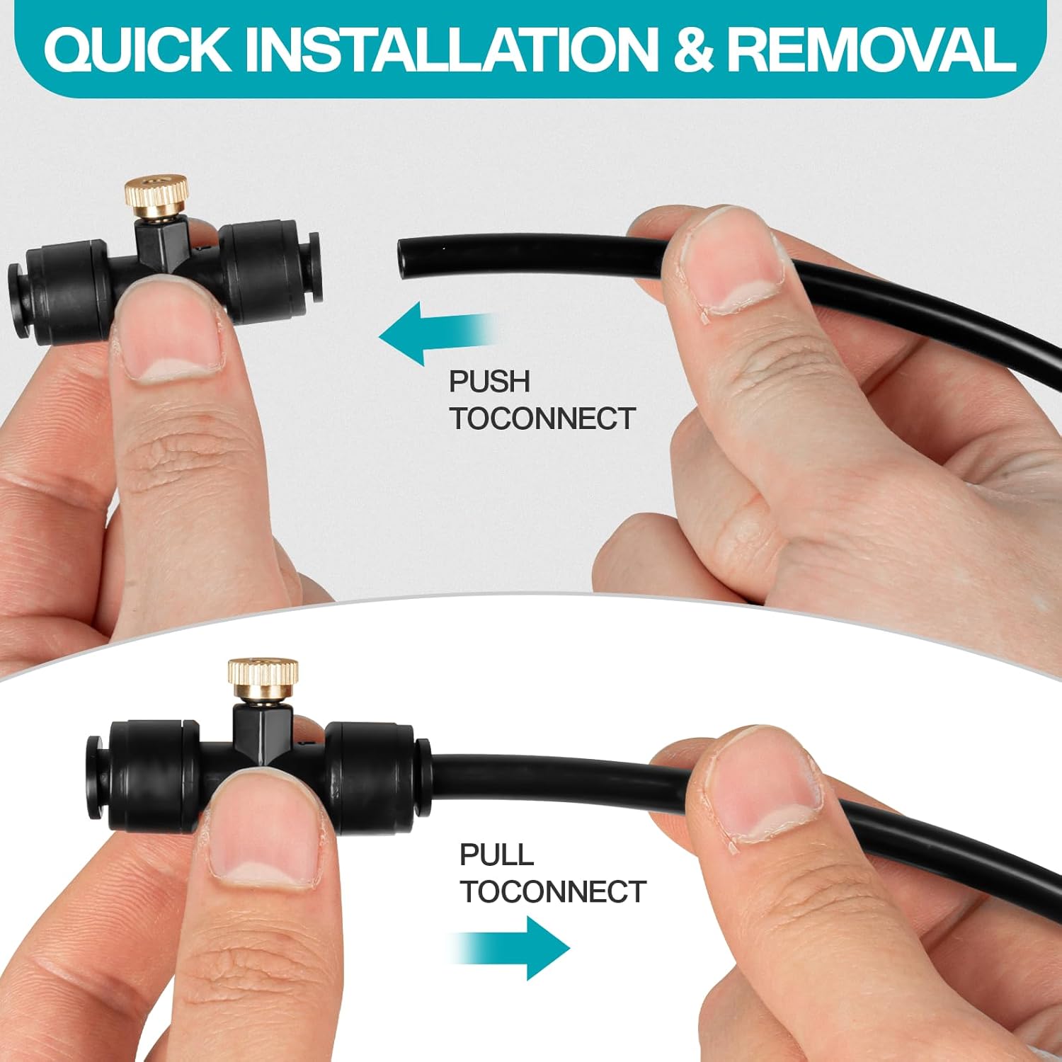- Plug-and-Play: Our misting system for patio comes with all essential tools, like a pipe cutter and T-joints, ensuring easy installation. Whether you're a DIY pro or a novice, you can create your misting oasis in minutes, letting you enjoy outdoor fun