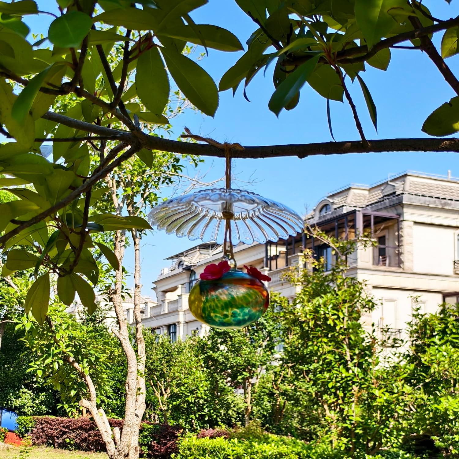 Small Glass Hummingbird Feeders for Outdoors Hanging - Hand Blown Glass Ball Nectar Feeding + Rain Cover, Multi Color with 3 Flowers Feeding Ports, Decor for Garden/Backyard Outside