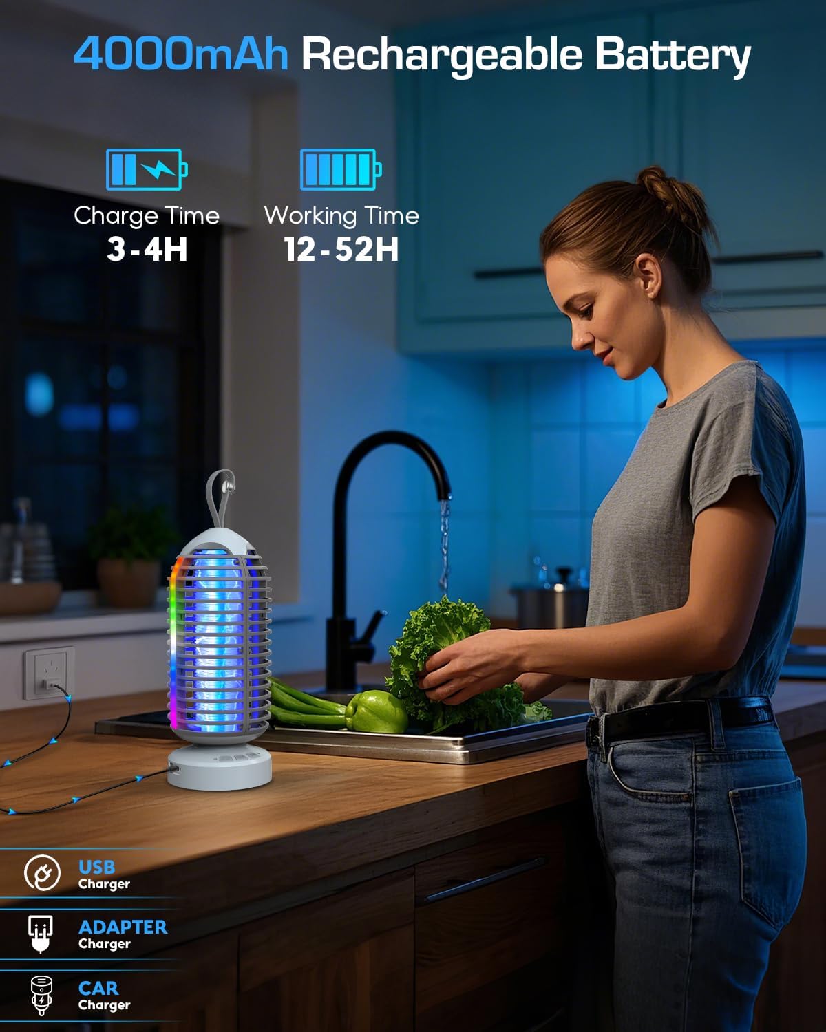 - Rechargeable 4000mAh Battery: This indoor fly zapper features a high-capacity 4000mAh battery, offering extended runtime: 12–16 hours in mosquito light mode, 7–18 hours in night light mode, and 17–52 hours in ambient light mode.With quick USB-C charging, it takes just 3-4 hours to fully recharge. Enjoy the freedom of cordless operation—whether at home or on the go, its portable, cordless design ensures continuous mosquito protection, letting you sleep peacefully without interruption.