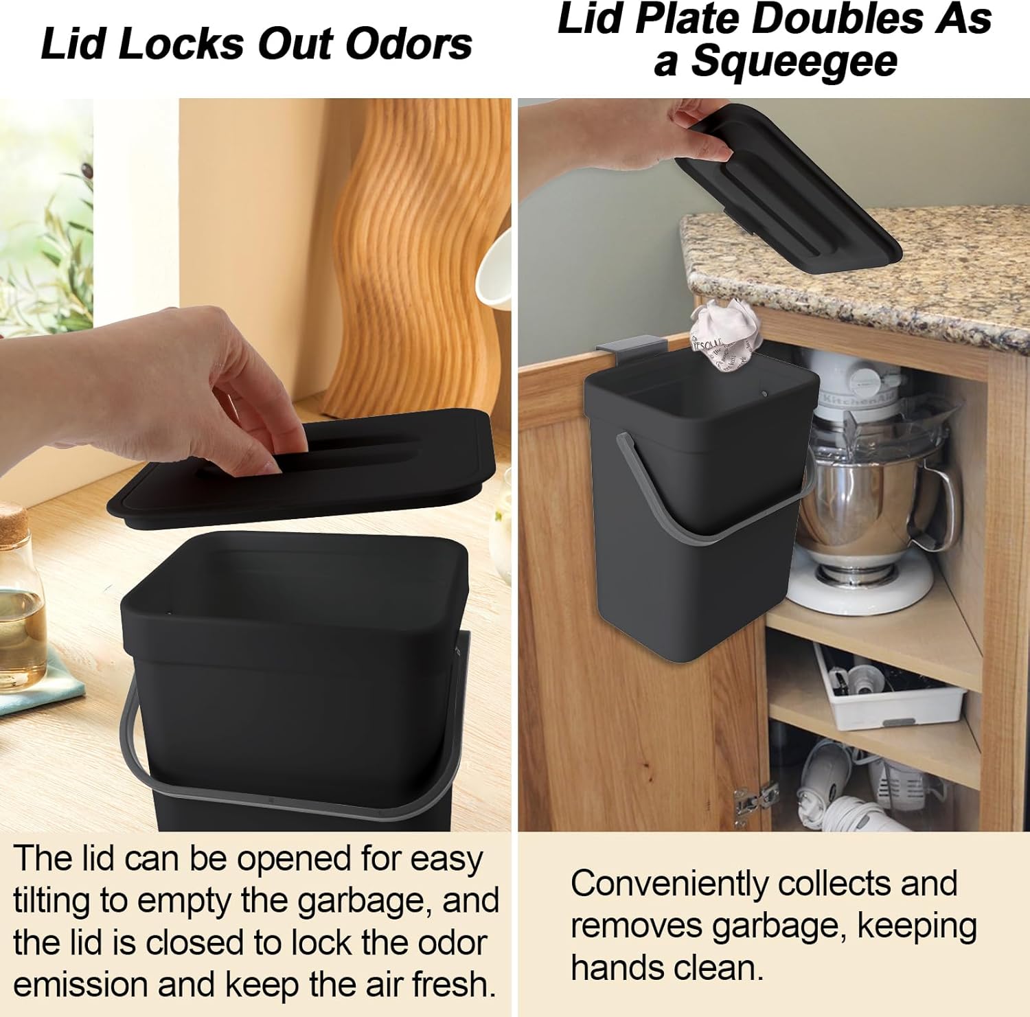 Compost Bin Kitchen, for use on Countertops or Under Sinks, Hanging Trash Can with Lid, for Cupboard/Bathroom/Bedroom/Office/Camping, Mountable Indoor Compost Bucket(Black 0.8 Gallon/3L)