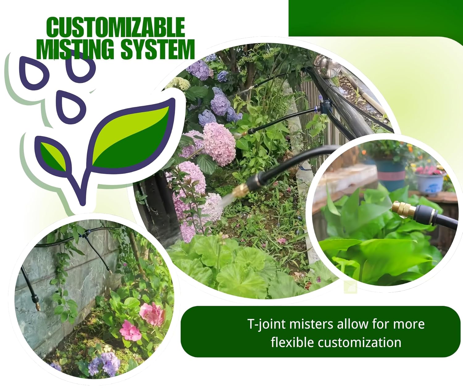 - 3. Each 360° adjustable misting nozzle consists of an 8-inch shape-memory tube and a high-quality brass nozzle. The flexible tubing holds its shape, allowing precise misting coverage in any direction.
